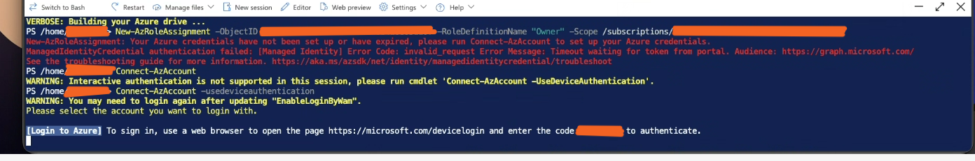 Connect-AzAccount -UseDeviceAuthentication(example below).