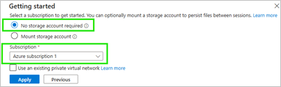 - Leave the default setting "No storage account required" selected and choose any subscription — it doesn't matter at this point.